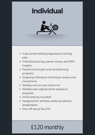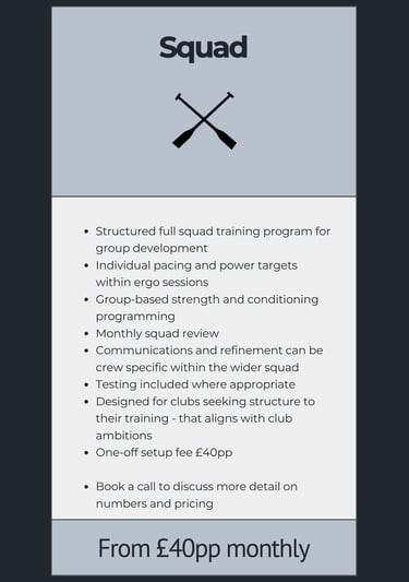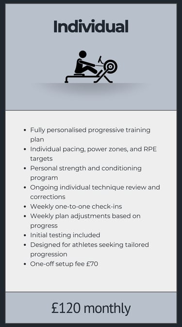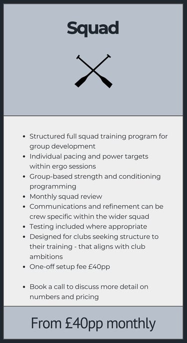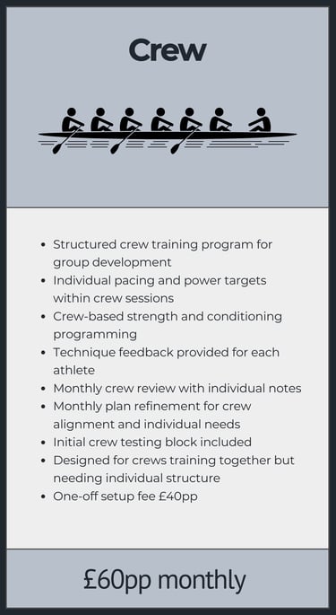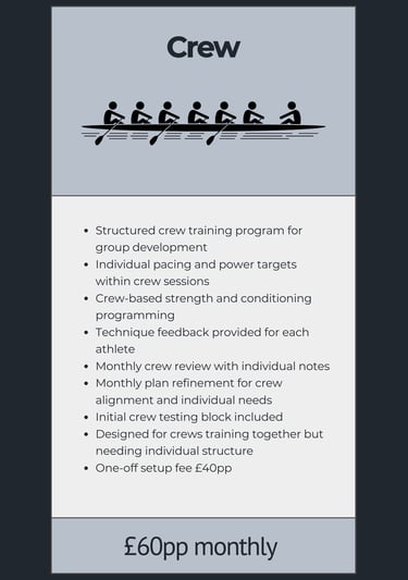 All coaching begins with initial testing and movement analysis, followed by a progressive training plan built around individual needs. Whether working with an individual, crew, or complete squad, sessions are targeted, structured, and designed to achieve sustainable improvements in power, technique, and overall athletic capacity.
